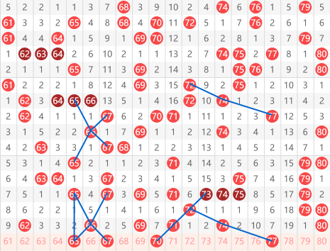 快乐8第2026059期61-80区域:推荐的第一个号码是65,我们看到上面是67,挨着66间隔一起给出65,下面刚好相反,是个67间隔一起给出66,再给出65,而且65和66之间有个经典的三角夹角走势,再往后就是这个67。大家看到65向上给出66,再带着67向下的走势是完全相同的。所以65和67其实是一个二选一的走势。下面是这个70后,他本身有一个大的三角一直没有给出,同时有一个斜连。再往后就是这个77,我们看到上面是69间隔2给72,间隔一给74,再间隔2给77,下面的走势是完全相同的,而且在走势当中我们看到74开出之后,多数会给出77。这是今天推荐给大家的所有的号码。只是个人想法,具体的大家根据自己的思路进行选择,或者前往直播间。昨天直播间开出10码。