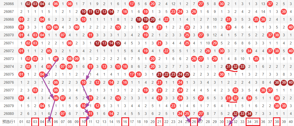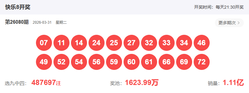 首先我们看下上期开奖结果,快乐8第26080期开奖结果:07 11 14 24 25 27 32 33 34 46 49 52 54 56 59 60 61 66 69 72,和值为:851,大小比例为: 11:9,四区3:6:7:4,开出一组两连号:24+25,两组三连号,分别是:32+33+34,59+60+61,直连重号出了2个,分别是: 60, 66,其中60为三连重号,66为两连重号,我们把01-40分为前区,41-80分为后区, 则上期大号较多,未开出冷号,均为热号和温热号。