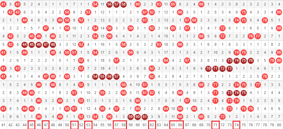 接下来我们一起看走势图,我们把01-40分为前区,41-80分为后区。