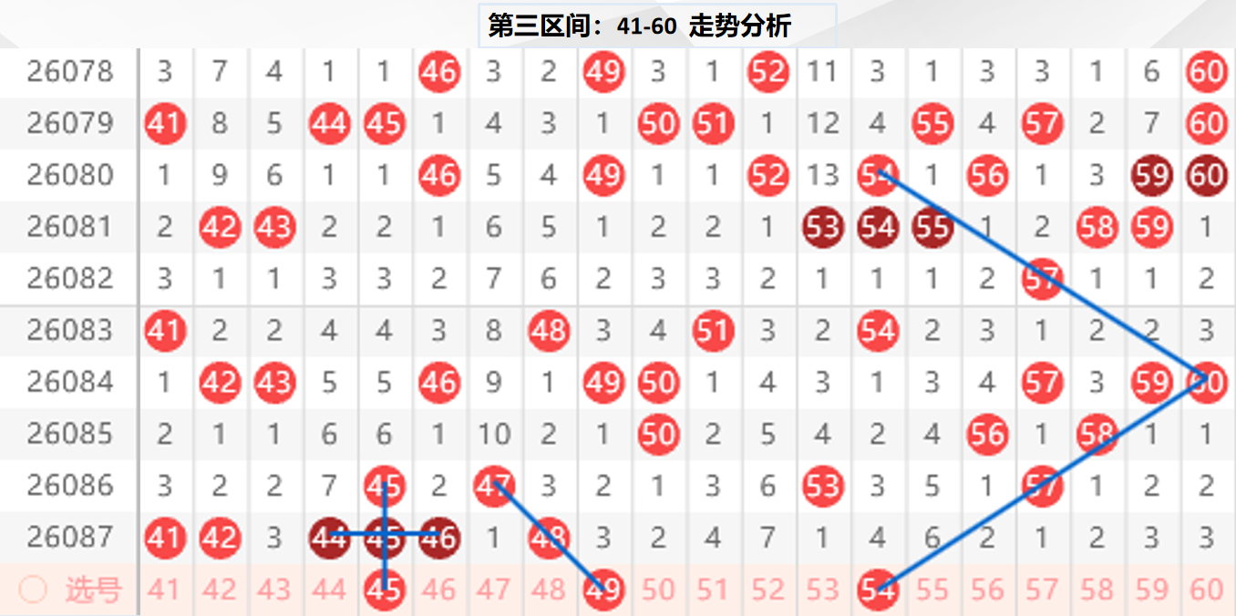 三区分析:【41-60】(走势图标注号码非小黄车大底,请谨慎参考,具体思路将在直播间分享讨论)