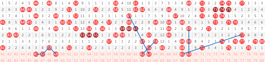 【第二区间41-80】:上期开出10个号码。本期推荐:46-47-49-62-63-68-69七个号码。46-47-49为6、7、9尾间接连号形态,近期4头一直出号比较稳定,在区间号码遗漏2期后以此形态号码回补;62为“T”斜连形态,63斜连四期;68左右同路指向,同时在上期8尾爆发后的重号考虑;69遗漏一期的形态号码。区间推荐重点号码:三小区间47-49,四小区间62-68-69。