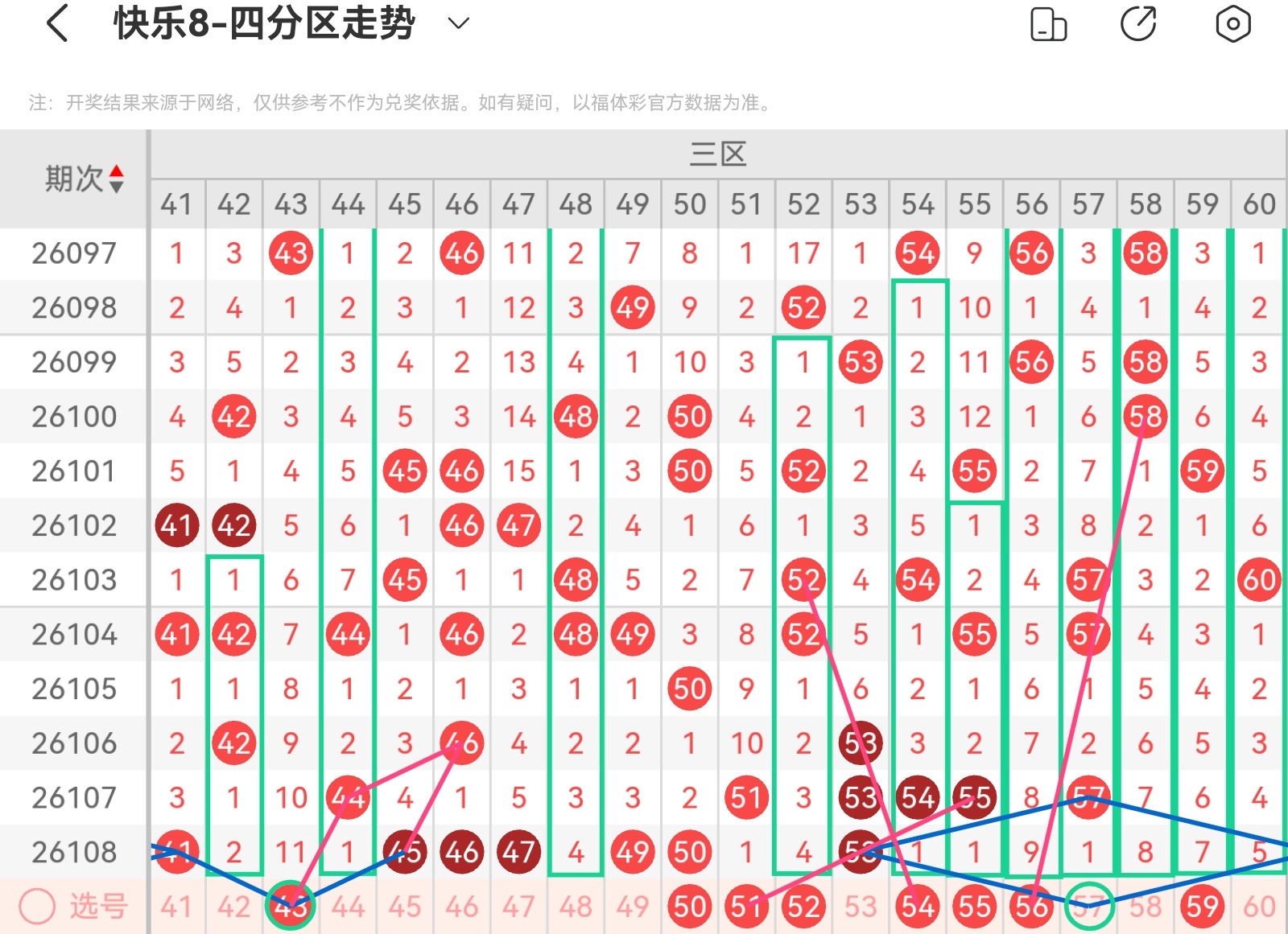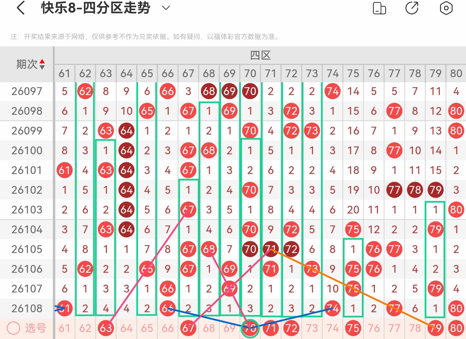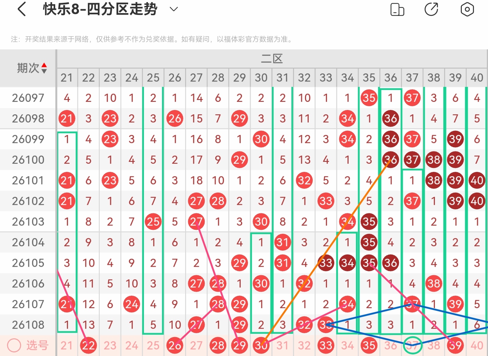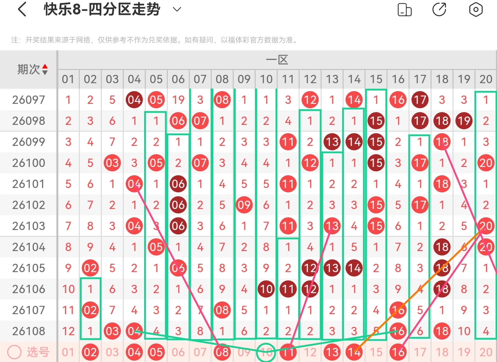 大家好,我是甜丝丝的坏事,主要以快乐八的形态走势、空位走势、遗漏走势以及斜连走势相结合的方法,用公认的四分区走势来进行预测分析,希望能让你有所收获。
