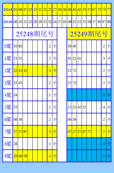 本期看好号码开出的范围是2码规律至4码规律之间。近13期开出重尾号的分别是,25237期尾3出5个、25238期尾4+6+7+9各出3个、239期尾1+5各出4个、240期尾5出4个、25241期尾3+8各出4个、242期尾3出4个、243期尾7出5个、25244期尾2+3+4+8各出3个、25245期尾1出4个、246期尾7出3个、25247期尾5出4个、25248期尾2+7+9各出3个、25249期尾7出5个。看好6期之内重尾号再次开出多码规律,概率在在九成左右。另外重尾号有开出6码的可能性,大家可以筛选一下,本期看好的两个尾号是2、5尾。