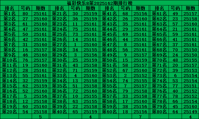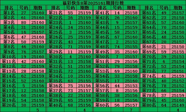最后再把号码分为五区:一区01-16号、二区17-32号、三区33-48号、四区49-64号、五区65-80号,理论上每个区每期应该开出4个号码,以各区最大遗漏值选择各区号码;2025161期五区比例:3:3:6:4:4