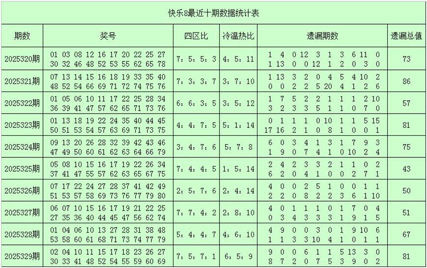 一、快乐8第2025330期奖号分析(定义:遗漏0-2期号码为热码,遗漏3-6期号码为温码,遗漏7期及7期以上号码为冷码,重码为上期开出奖号,邻码为上期没有出现,但与上期奖号差值为1的号码,例如上期开出奖号04,没有出现号码03和05,则本期03和05都为邻码,其它则为孤码。