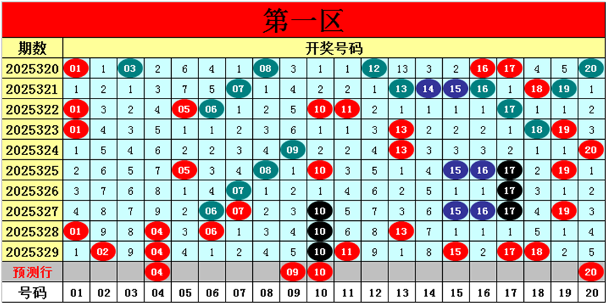 目前第一区包含13个热码:重码7个02、04、10、11、15、17、18,邻码3个01、16、19,孤码3个06、07、13;包含4个温码:邻码2个05、09,孤码2个08、20;包含3个冷码:邻码3个03、12、14,孤码0个;号码冷温热个数比为3:4:13,重号、邻码、孤码个数比为7:8:5。