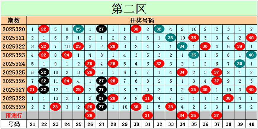 目前第二区包含14个热码:重码5个23、26、27、30、33,邻码5个22、25、28、31、40,孤码4个21、35、36、38;包含5个温码:邻码3个24、32、34,孤码2个37、39;包含1个冷码:邻码1个29,孤码0个;号码冷温热个数比为1:5:14,重号、邻码、孤码个数比为5:9:6。