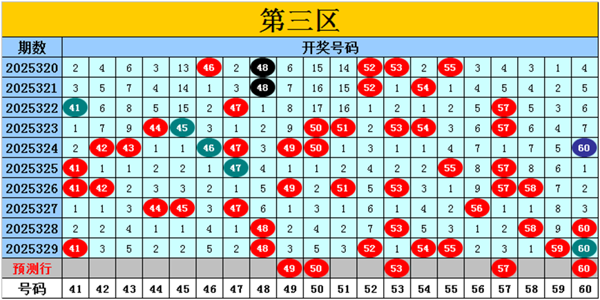 目前第三区包含13个热码:重码7个41、48、52、54、55、59、60,邻码4个47、53、56、58,孤码2个44、45;包含7个温码:邻码3个42、49、51,孤码4个43、46、50、57;包含0个冷码;号码冷温热个数比为0:7:13,重号、邻码、孤码个数比为7:7:6。