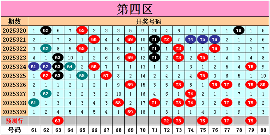 目前第四区包含9个热码:重码1个69,邻码2个61、68,孤码6个62、71、73、74、77、79;包含8个温码:邻码0个,孤码8个63、64、65、66、67、75、76、80;包含3个冷码:邻码1个70,孤码2个72、78;号码冷温热个数比为3:8:9,重号、邻码、孤码个数比为1:3:16。