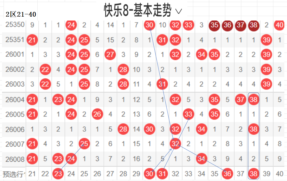二区(21-40):遗漏5期以下有16,021 23 24 34  4,数据所示,冷码平均,选择条件增多了.上期开出了4个号码,出码比较分散.这期布防相应增加,重码按比例落这区较少,先给出关联码31,这个区间间接走势,温区,21-30区间上期开了2个,依旧不是重点选号区间,31-40区间开出1个,本期关注热码的回补,间隔小遗漏值最佳,3字头转热,这个小区热码注意回调,可以做关联码的布局,注重温冷码的回补.