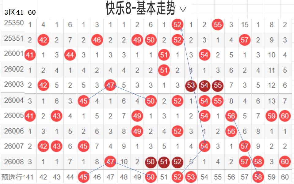 三区(41-60):遗漏5期以下有17,047 50 51 52 57 58 60  7,温开方式,这区码数有回暖之意,可以防一手,先定胆码走势较大者,隔期,斜三连,分边号码,可重防,间隔5以上号码可以随走势选取,例如本期大冷码,走势比较大,可以做胆,通常联动可带出,分边对称的号码,本区间也有很大走势.可关注下.隐形夹角号码.做补位形态号码.都需要观察动态走势.以上是本区间的选码方法.