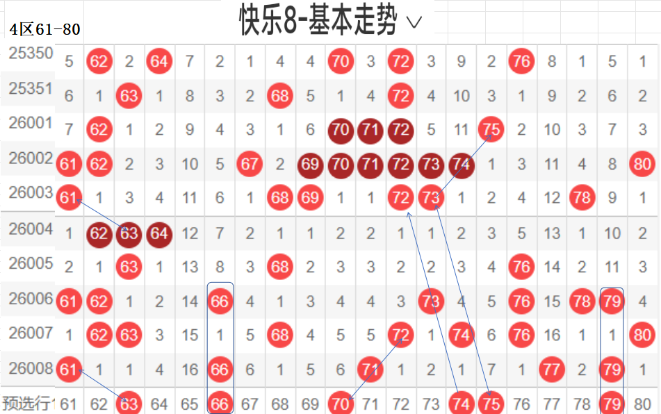 四区:(61-80):遗漏5(5)以下有16,061 66 71 77 79  5,平均温开方式,上期开出5,区间回暖,后区可防,区间从以往数据来看,重码很强,一枝独秀的存在,近期有回补走热的趋势,区间回暖,本区间后区可防,与一区相比,也是温区.,对称下落,隔期回补码,可以防,这区对呈对称三角关系的胆码,斜三连有走势的胆码,联动落位码,都有各自的走向落位关系,根据走势选择一种方式选码.