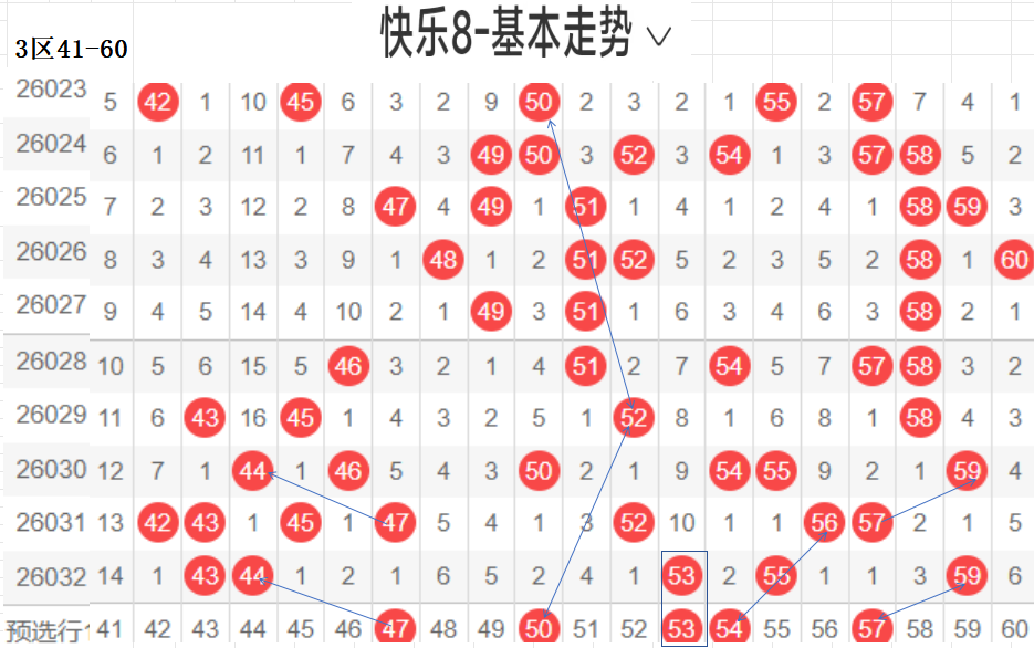 三区(41-60):遗漏5期以下有17码,0码43 44 53 55 59 5个,温开方式,这区码数有回暖之意,可以防一手,先定胆码走势较大者,隔期,斜三连,分边号码,可重防,间隔5期以上号码可以随走势选取,例如本期大冷码,走势比较大,可以做胆,通常联动可带出,分边对称的号码,本区间也有很大走势.可关注下.隐形夹角号码.做补位形态号码.都需要观察动态走势.以上是本区间的选码方法.