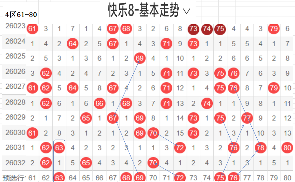 四区:(61-80):遗漏5期(含5)以下有20码,0码62 65 70 3个,平均温开方式,上期开出3码,区间回暖,后区可防,四区间从以往数据来看,重码很强,一枝独秀的存在,近期有回补走热的趋势,区间回暖后,本区间后区可防,与一区相比,也是温区.,对称下落码,隔期回补码,可以防守,这区对呈对称三角关系的胆码,斜三连有走势的胆码,联动落位码,都有各自的走向落位关系,根据走势选择一种方式选码.