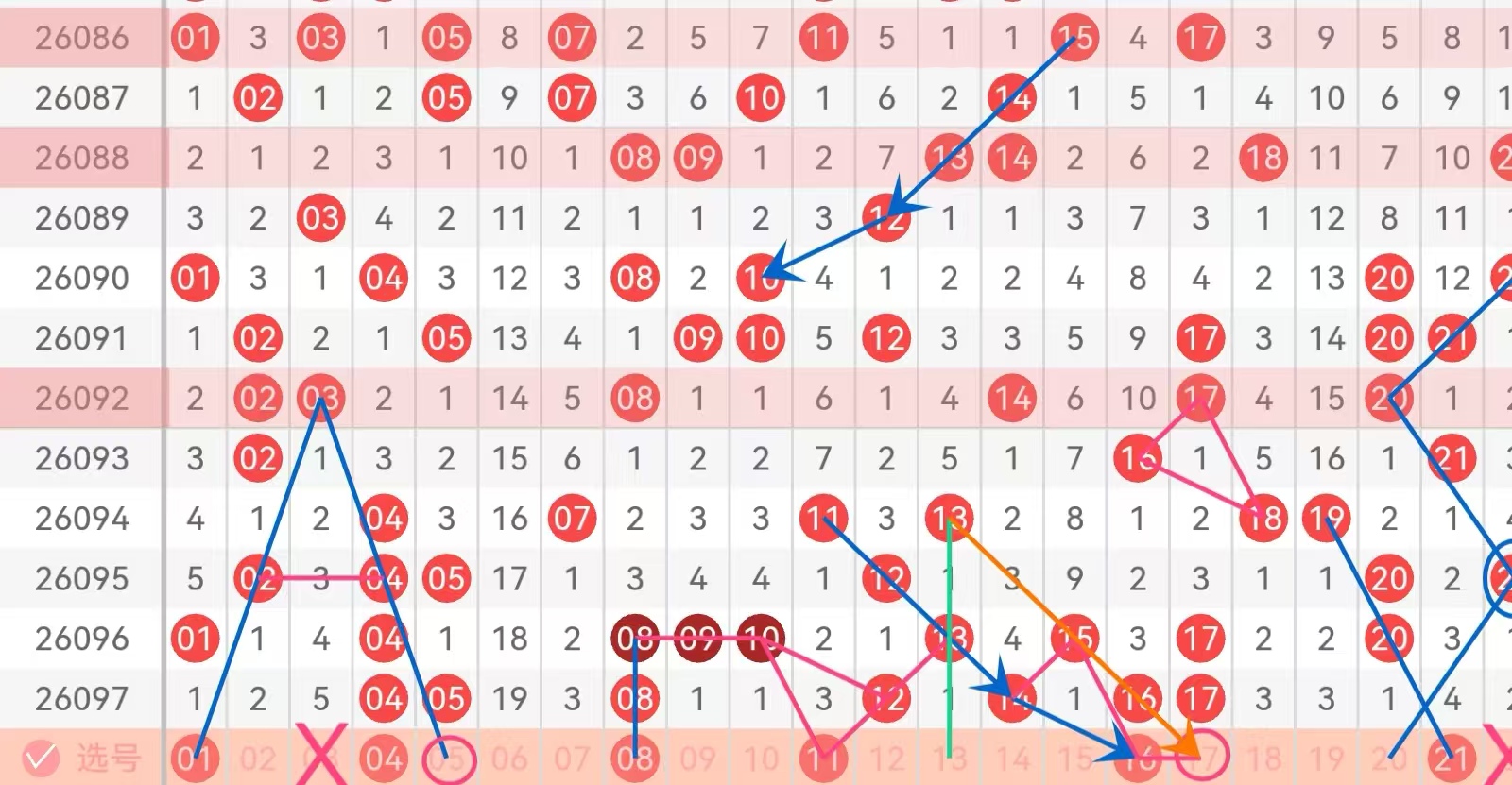 一区间推荐主做号码01 04 08 11 16防守号码05 17;