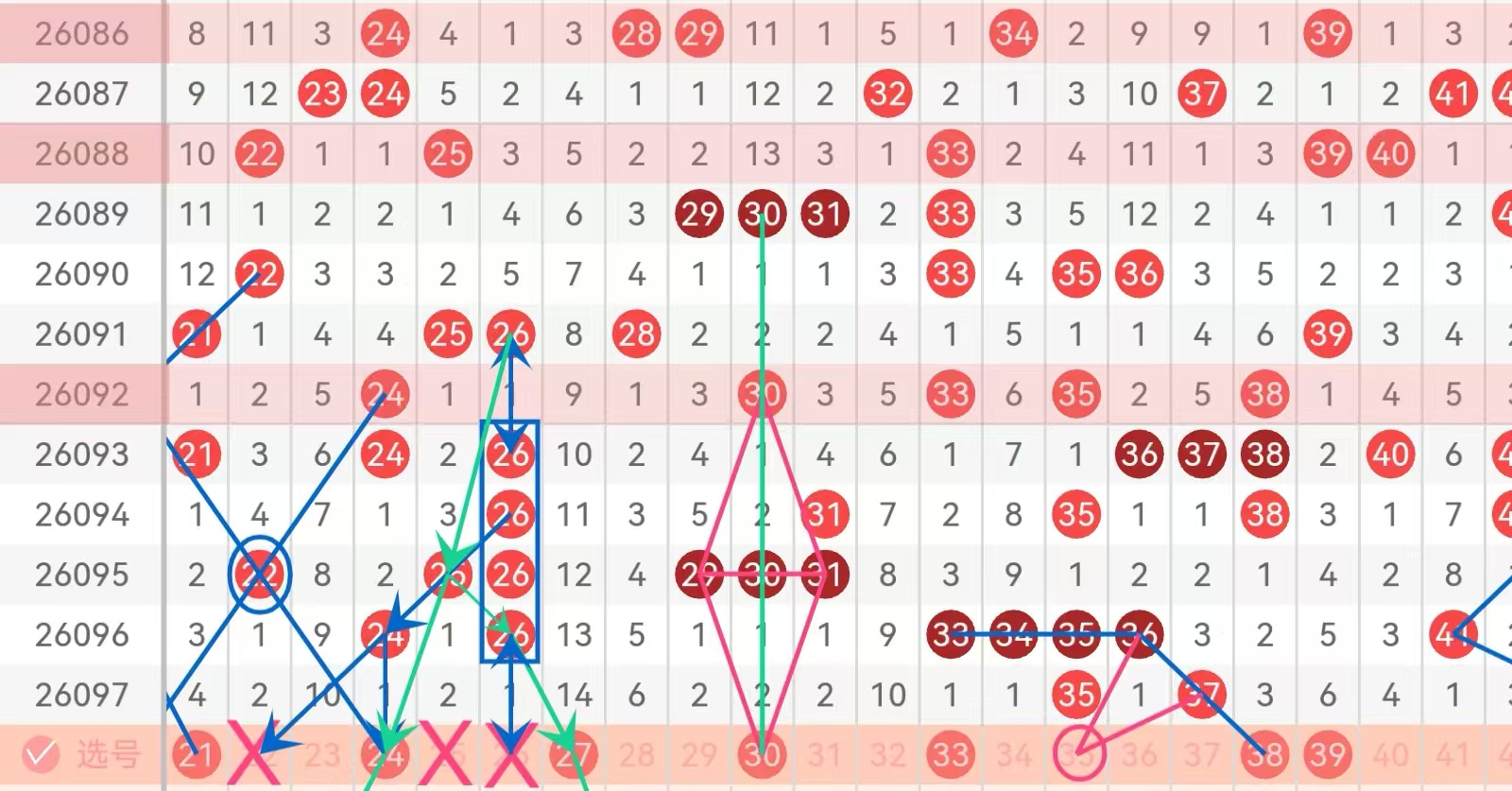 区间推荐主做号码:21 24 27 30 33 38 39防守号码32 35;