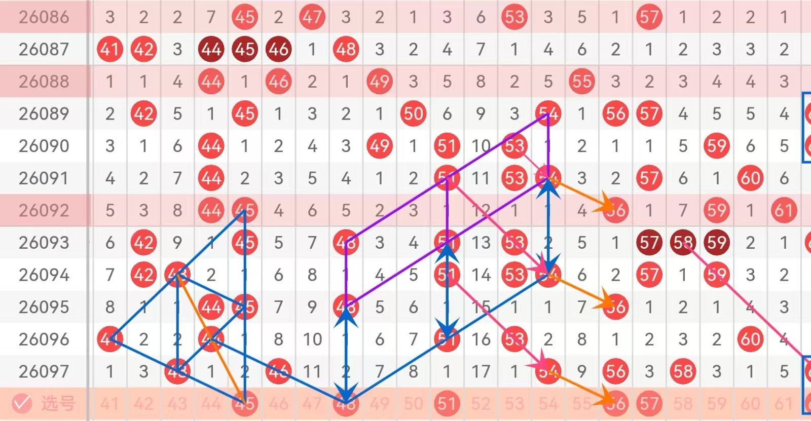 区间推荐主做号码45 48 51 56 57防守号码43 44 58;