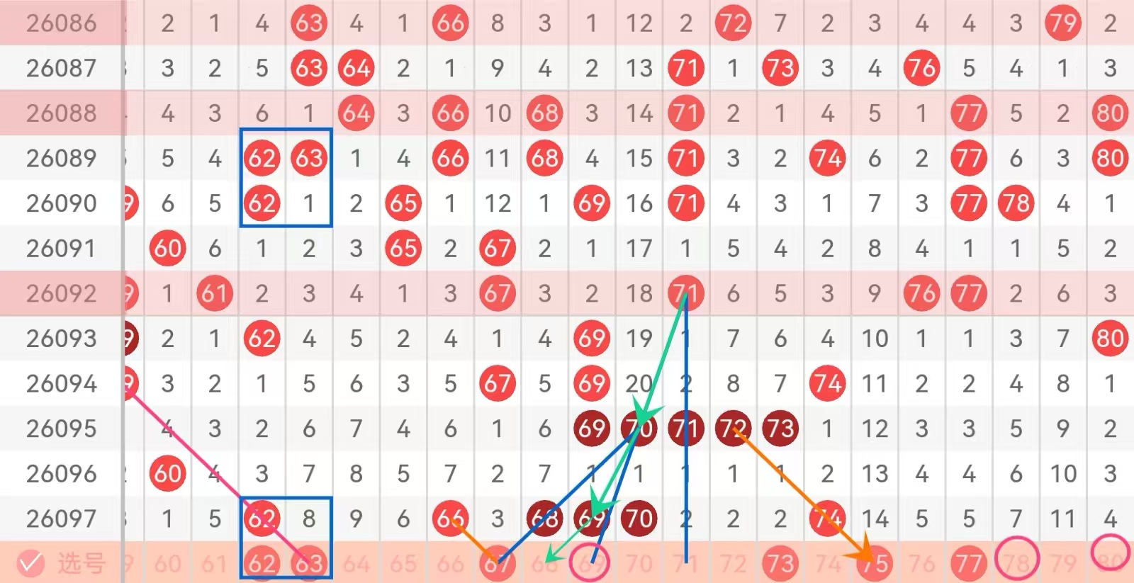 四区 间给到主做号码球62 63 67 73 75 77  防守号码65 69 76 78 80;