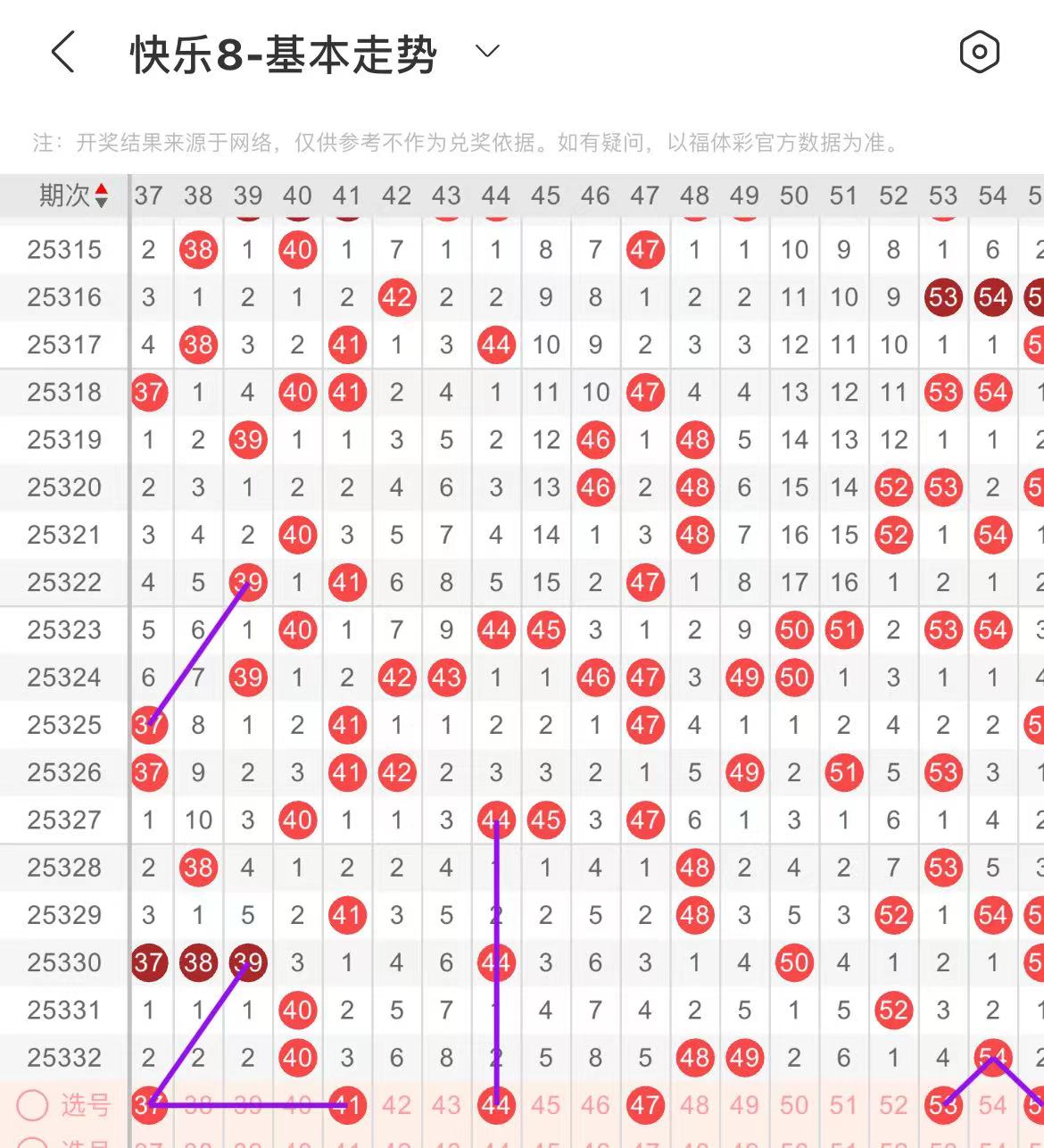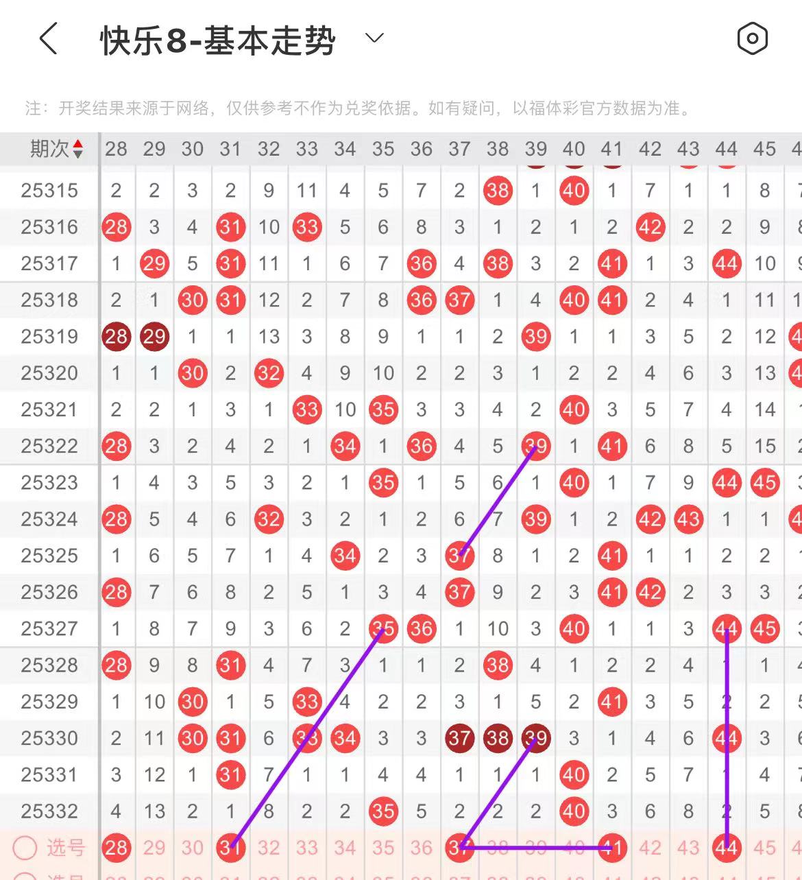 31-40区:本区间上期开出了两个号码,从号码走势图上看,该区现属于温号区,跟2头区一样,出号个数应该不是很多,两个号码左右。有出号走势的号码有31号,斜连出号走势,后半区37.38.39连号,本期要考虑有一码回补,可考虑37号或者37.40组合号码回补。