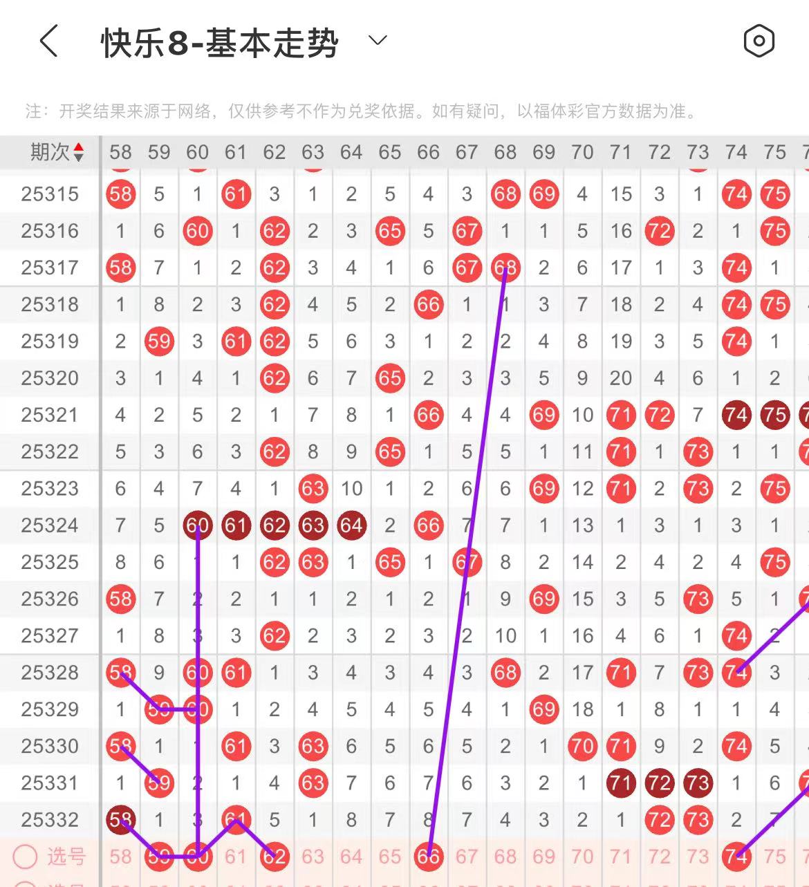61-70区:本区间上期开出了一个号码,从号码走势图上看,该区现属于冷号区,后半区空白区域比较大,可防范出号个数突增的可能。本期有出号走势的号码有62号,做为边号开出,66号,斜连出号走势。