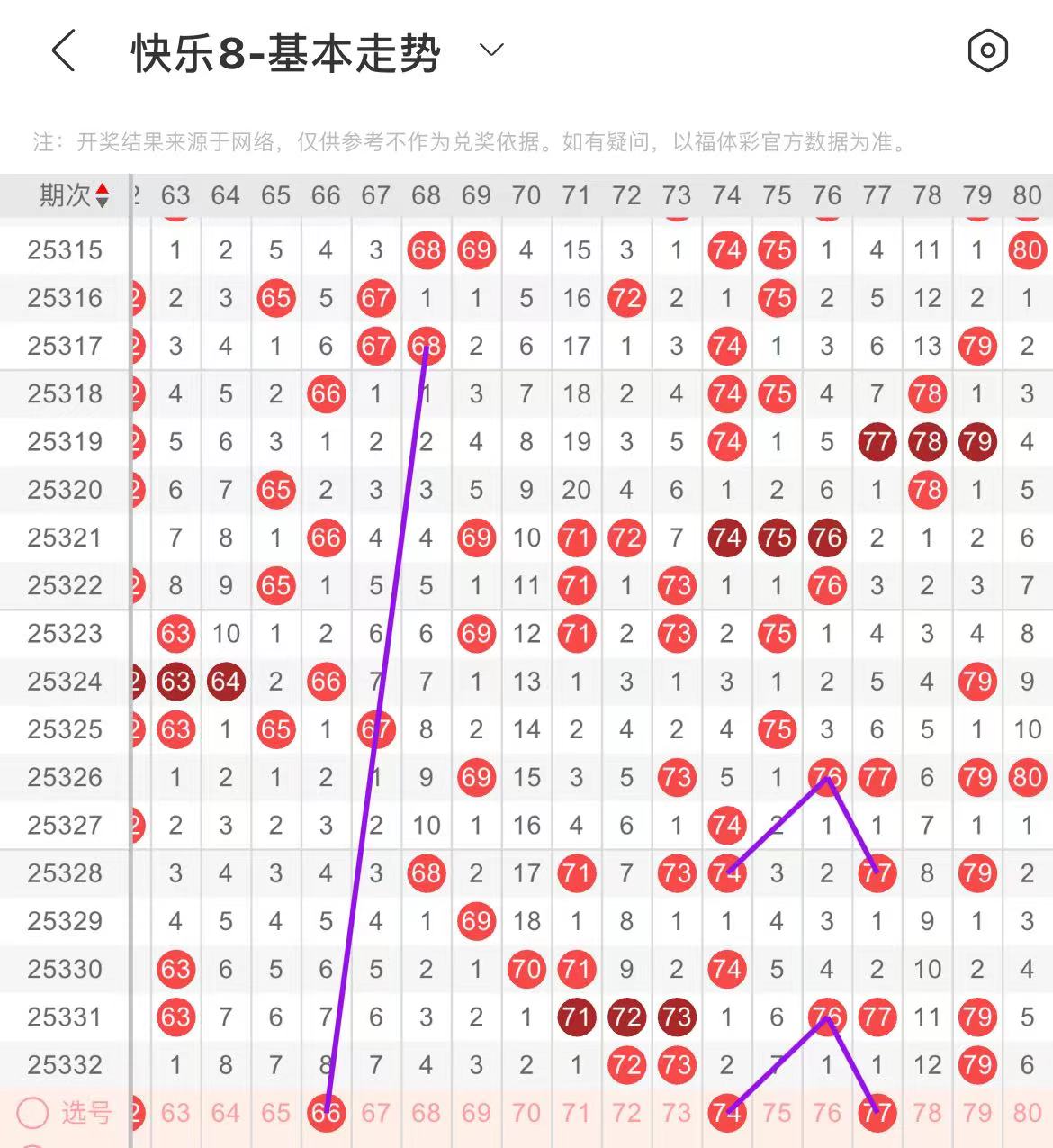71-80区:本区间上期开出了三个号码,从号码走势图上看,该区连续走热,本期注意出号个数有减少的可能,在选号上需谨慎。有出号走势的号码有74.77号,组合号码回补。