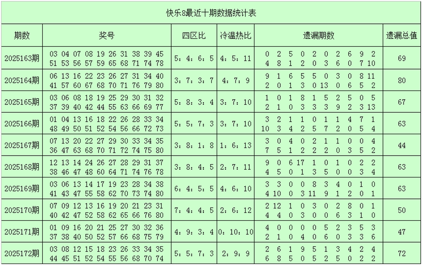 一、快乐8第2025173期奖号分析(定义:遗漏0-2期号码为热码,遗漏3-6期号码为温码,遗漏7期及7期以上号码为冷码,重码为上期开出奖号,邻码为上期没有出现,但与上期奖号差值为1的号码,例如上期开出奖号04,没有出现号码03和05,则本期03和05都为邻码,其它则为孤码。
