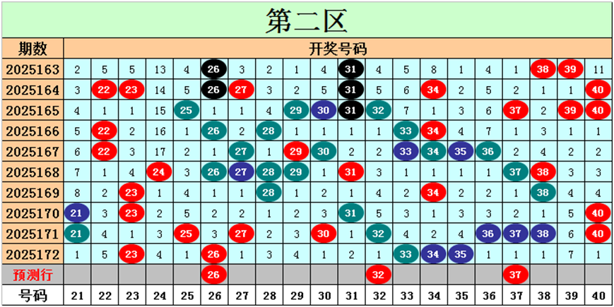 目前第二区包含15个热码:重码5个23、26、33、34、35,邻码4个25、27、32、36,孤码6个21、30、31、37、38、40;包含4个温码:邻码2个22、24,孤码2个28、29;包含1个冷码:邻码0个,孤码1个39;号码冷温热个数比为1:4:15,重号、邻码、孤码个数比为5:6:9。