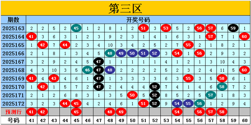目前第三区包含12个热码:重码7个44、45、51、52、54、55、56,邻码2个50、57,孤码3个42、47、58;包含6个温码:邻码2个43、46,孤码4个41、48、49、60;包含2个冷码:邻码1个53,孤码1个59;号码冷温热个数比为2:6:12,重号、邻码、孤码个数比为7:5:8。