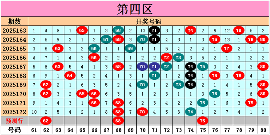 目前第四区包含10个热码:重码3个68、70、74,邻码1个75,孤码6个62、65、66、76、79、80;包含6个温码:邻码2个71、73,孤码4个63、64、72、78;包含4个冷码:邻码2个67、69,孤码2个61、77;号码冷温热个数比为4:6:10,重号、邻码、孤码个数比为3:5:12。
