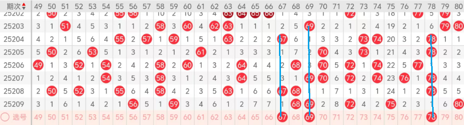 第四区间的走势分析:第四区间上期开出了五个号码球,主要的落号点位在四区间的中间位置,走出了两奇三偶的形态,四区间的走势开始有所变冷,单式落号的趋势还是有的,今天的龙头我们主看67这个号码球的落位,再看69的重码,和68形态一样,今天这里应该有号码落下,最后关注78这个热码的回补!不管处于三码形态,都和78相关联,所以今天重点关注这个号码球!