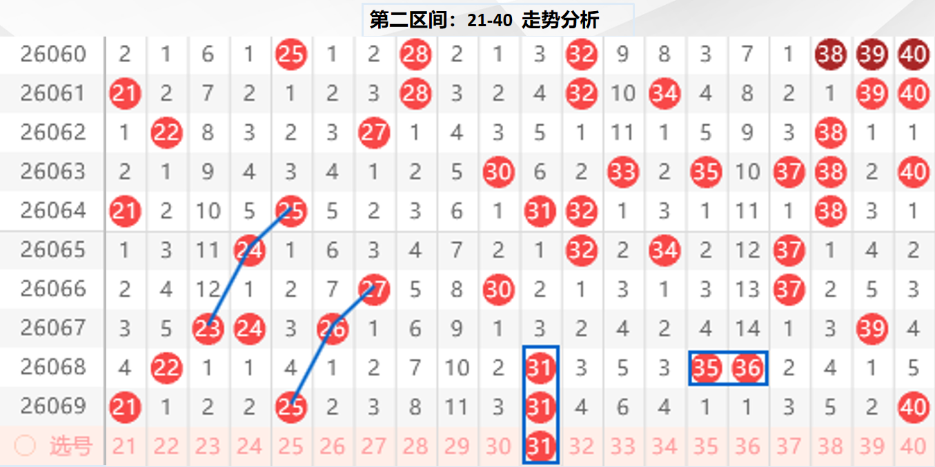 二区分析:【21-40】(走势图标注号码非小黄车大底,请谨慎参考,具体思路将在直播间分享讨论)