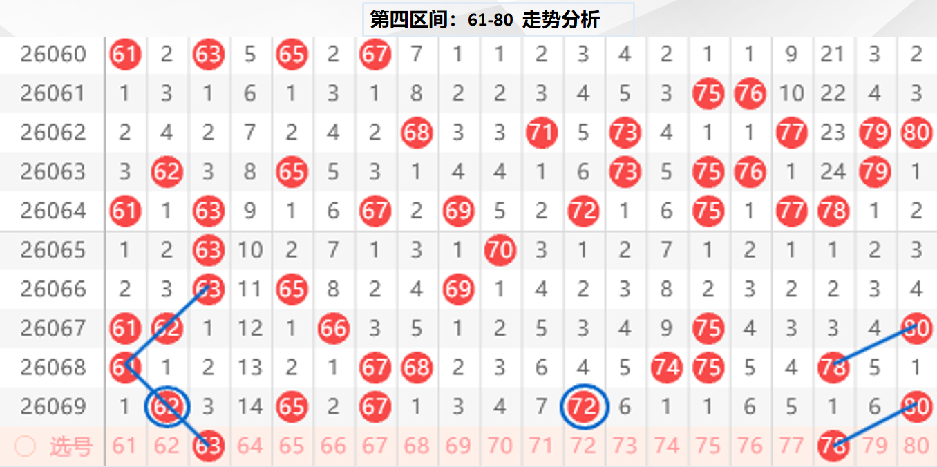 四区分析:【61-80】(走势图标注号码非小黄车大底,请谨慎参考,具体思路将在直播间分享讨论)