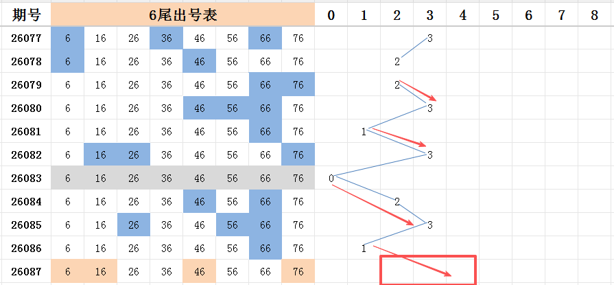 本期看好开出的范围是两码走势至四码走势之间。六尾上期开出一码走势,本期看好六尾的两个尾码:号码66和号码76,看好能够开出其中一个号码或者两码全开。号码66是四连号的号码走势,号码76是间隔四斜连的号码走势,均属于本尾比较有规律的号码走势,如果本尾能开出多码走势,那么有规律的号码大概率会开出。另外看好两个首码能够开出其中一码或者两码都开出。