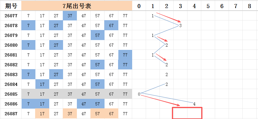 本期看好开出的范围是两码走势至四码走势之间。七尾上期开出四码走势,上期选择七码的号码,四码中二码,围中选二复式!上期主要给大家说的号码,就是07和57,一个是间隔2期的三连号,一个是间隔1期的三连号,结果都开出了。本期看好重号17和57能够开出其中一码。另外看好冷号37和67能够开出其中一码。