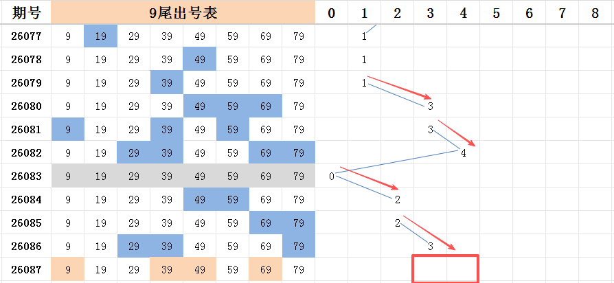 本期看好开出的范围是两码走势至四码走势之间。九尾上期开出三码走势,上期选择九码的号码,四码中二码,围中选二复式!本尾主要考虑遗漏值,看好号码39走重,遗漏1期的号码看好号码69的开出,遗漏2期的号码看好号码49的开出,冷码看好号码09的开出。