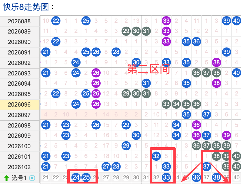 上期二区开出7个奖号(21.27.28.33.37.39.40)上期回顾二区开出7个奖号二区间在上期落位同比前期的话呈现了一个递增落位趋势,先来看本期号码24整体活跃度较热,在近 30 期里有一定的间歇性出现,不是每期都开,近期整体走势还是很稳定。号码33近期热度较热,间隔性整体比较热,说明其在当前阶段活跃度较热注意防守。号码36近期活跃度较热有一定的间歇性近期整体走势相对还不是很稳定有特别明显的冷热趋势变化,号码38近30期内活跃度较热,没有明显的连续出现形态走势,整体表现比较热。