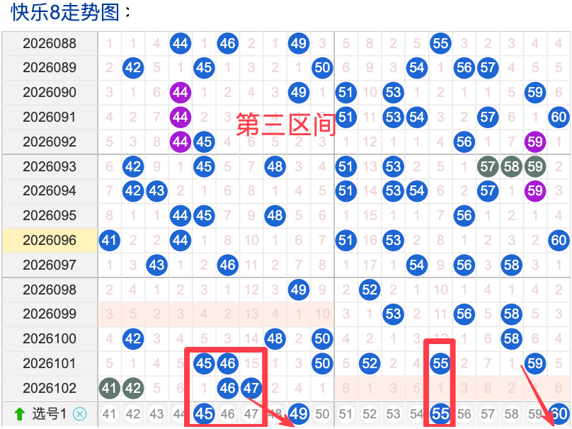 三区间开出了4个奖号(41.42.46.47)上期回顾三区开出4个奖号上期的三区间的奖号数量呈现一个递减的形态,4头回补4个,5头断号,本期先来看号码45期出现频率相对来说还是很稳定。时间隔期数也是很稳定,但是在近期的开奖中较热注意防守,号码49在近 30 期内出现次数相对是稳定的号码,近期的活跃度也是较温热。号码55有一定的间歇性,通常间隔5-10期会出现一次,没有明显的连续出现态势,走势相对还不是很稳定,在整个第三区间的表现较冷本期还是可以防守的。号码60走势相对近期较温热,近期没有连续间隔落号的情况,活跃度近期处于温热状态注意防守。