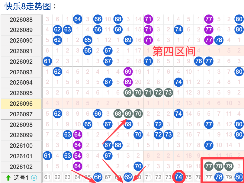 上期四区间开出了5个奖号(64.70.77.78.79)上期的四区开5个奖号呈现了一个递增趋势,开出的奖号6头回补1码,7头回补3个,先来看号码66在近 30 期内属于还是稳定的号码,近期出现频率相对温热,偶尔会间隔多期后出现一次,这个号码要注意防守,号码69具有一定的间歇性近期活跃度是很稳定比如有时会间隔3到8期就再次出现,有时会间隔多期,近期整体出现频率比较热,近期还是要关注的.号码74活跃度近期比较热,有一定的间歇性,整体走势有一定的波动性.