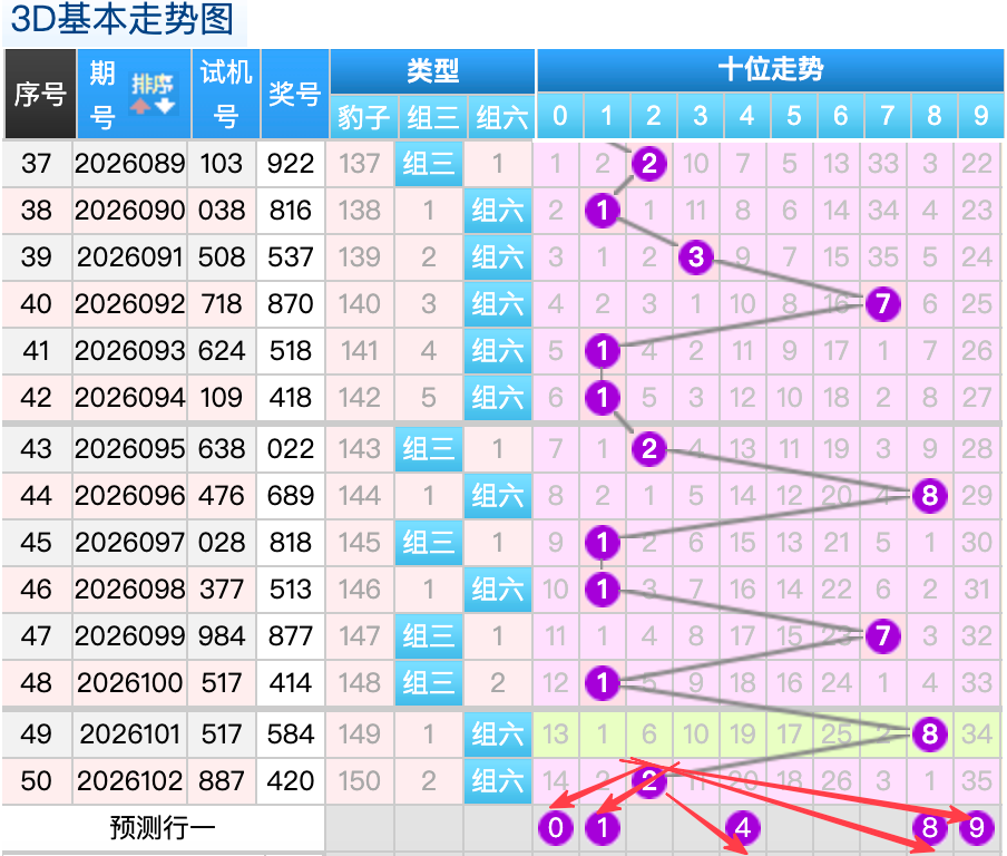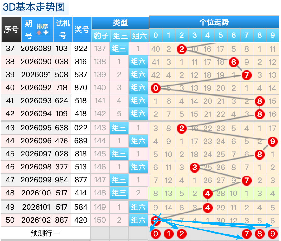 上期3D十位开出的奖号2号,上期在十位上2号球这个号码是一个错位折返回补码的落位点,本期来看1号在十位上要注意这个号码是有机会继续走出热号顺位码落位的趋势这里的号码回补形态注意防守就好,再来8号球这个点位注意防守走出折返号码的落位趋势。0号球这个小冷号的落位回补要注意参考。9号球要注意走出最大冷号的落位回补。