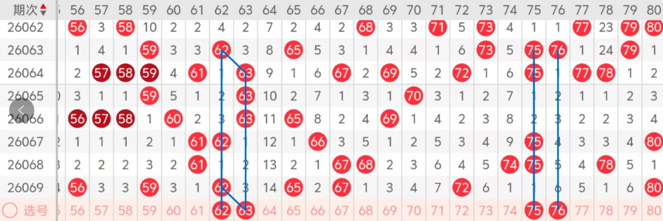 第四区间的走势分析:第四区间上期开出了五个号码球,主要的落号点位在四区间的前后半区,走出了两奇三偶的形态走势,上期四区间的前半区落下了三个号码球,后半区落下了两个号码球,整个四区间处于走热的趋势,根据四区间的走势规律,今天的四区间我们主看前半区62 63姊妹对号码的落位,也是热码的回补,再看后半区75 76姊妹对号码的落位,冷热码的组合,这四个号球建议大家打个四胆拖,或者打个四码复三比较稳妥,参考为主!