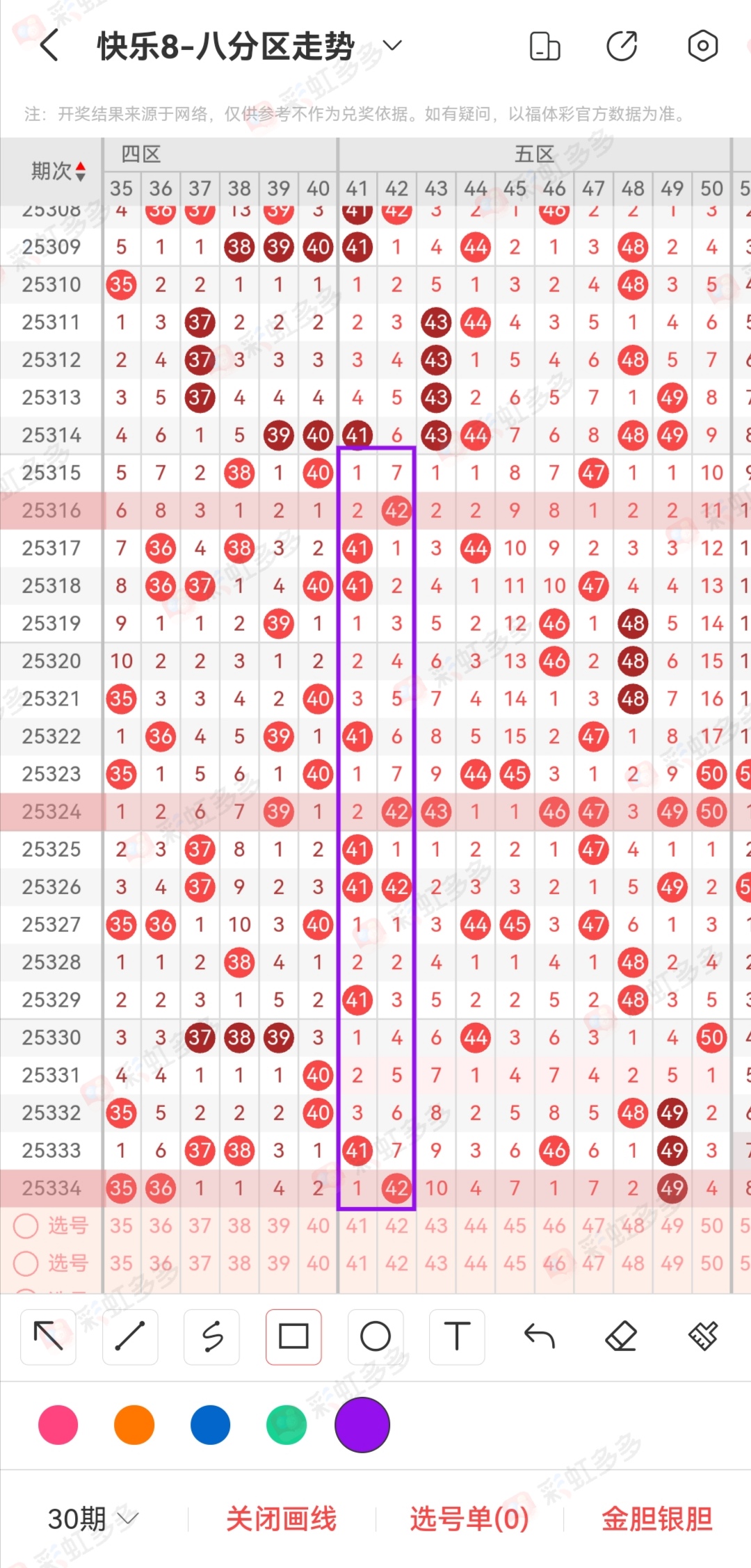 今天我们讲讲号码的独特理解。一开始考虑的点位就在于01 41 02 42。我们参考01和41的数据,在一段时间内,01走重间隔回补和41其实是一样的,这个状态当时和大家是说过的。我们来看一下42,42昨天的7期遗漏是考虑过的。42目前出现了3次7期,反过来看一下02,02是两次遗漏7期然后遗漏9期。其实要把42看成一个整体,其实这里的逻辑是一样的。42间隔1间隔7其实就等同于间隔9期。我们目前的01不是没有出现,其实可以反过来可以参考41。41是间隔3,等什么时候01出来了,只考虑一次变量,那么41是可以定位的。让我们拭目以待。暂时我们只能够大方向避坑42不走重,通过02的9期遗漏推理。至于别的数据总结,目前看不出来。毕竟变量后的数据期数太少。我们目前的找规律都是通过大量数据总结对比,且通过基本走势判断,到底哪一个规律延伸更加符合近期的走势。所以大家看到规律,不要立马定位,这就是想的多想的通。当然了,想法没有过错,只能说能够说服自己。
