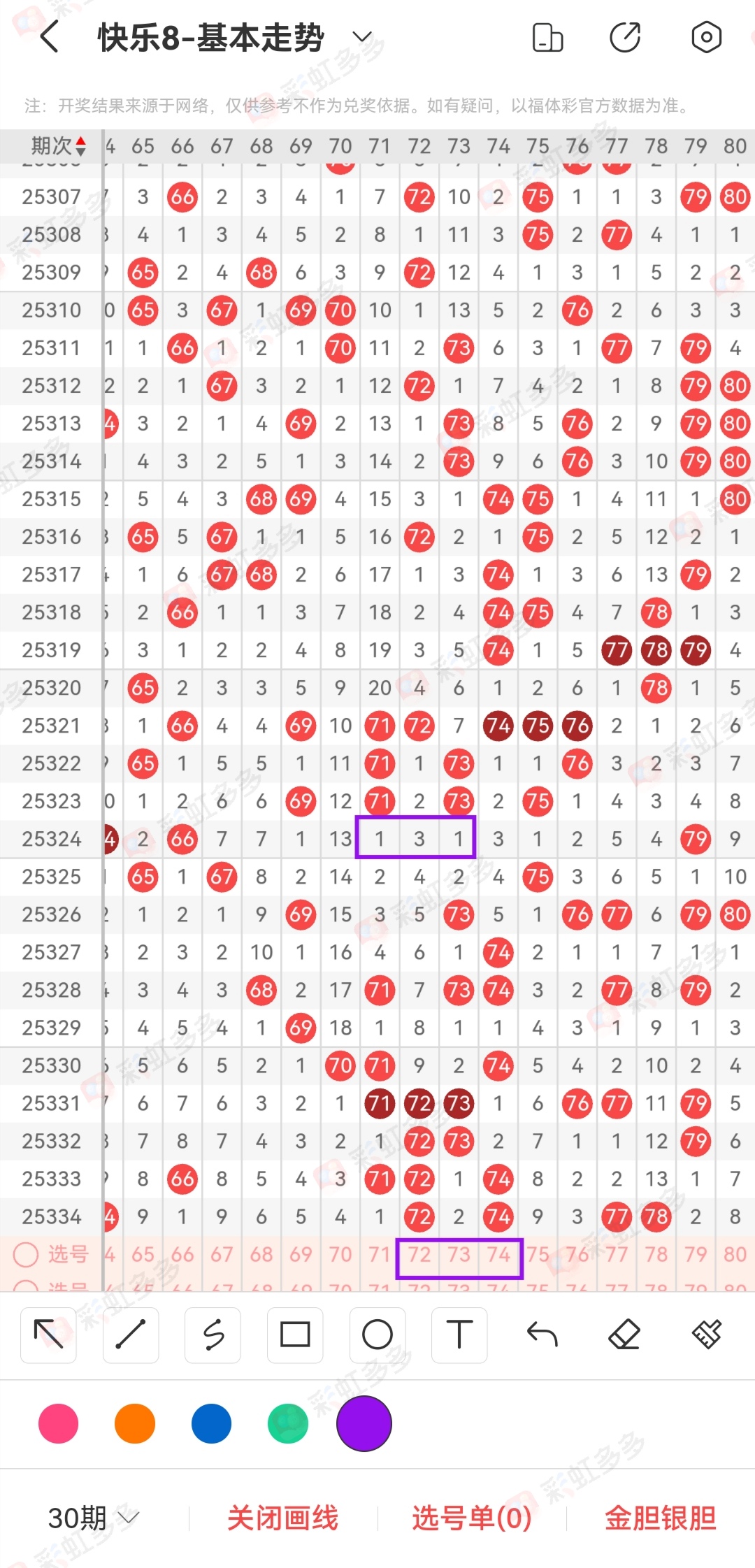 第二个点,我们看一下7头的数据。我相信大家都能够看到这个位置。我们基本的频道就是看到相同的结构都会认为是一样的走势。我举个例子,这个可能不太对。比方说我们看到02 08同出会考虑08走重,近期最近一期可没有出现。或者形态模仿,3期5期同出,考虑3期走重。但是近期的点位是5期遗漏号码走重。这里说明了一点,或者再举一个特殊的点。03的出现,昨天没有连带4期遗漏以及4期遗漏走重的号码同出。这些说明了什么,短期内,号码总结规律存在变量,或者多数规律以及规律延伸都是假象。60期数据规律以及80期数据规律,之前的稳定状态,我们在专属里面都有提示。但是近期都没有在遇到。所以需要返回来想,认为是空区,能不能不是空区,当然能!所以今天的72 73 74不要直接丢了,需要多少选一个打拖码也可以。很有可能你的选五就差这一个。