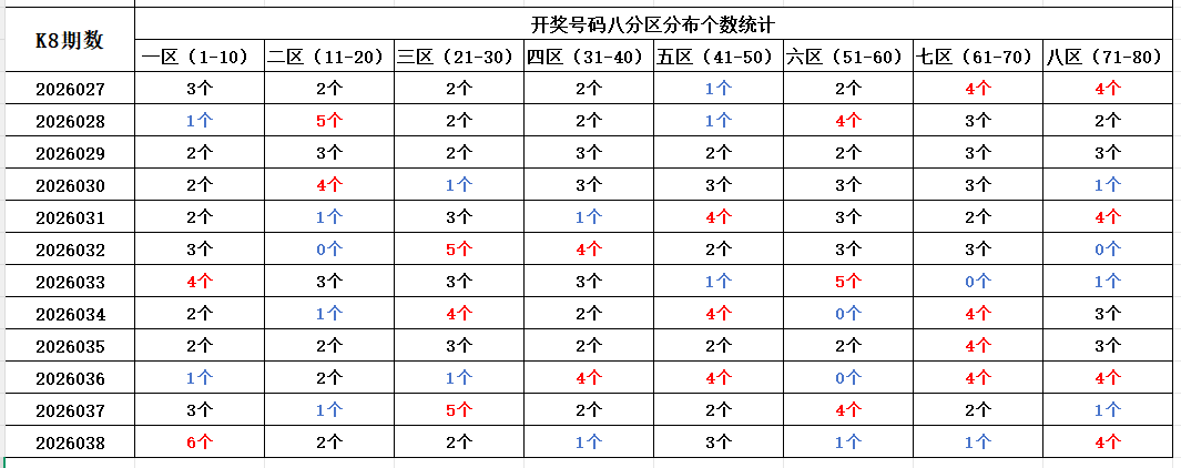 首先看上期回顾,“快乐8”第26038期开奖结果:3.4.5.6.7.9.11.20.21.26.36.44.46.47.54.68.73.74.75.80;通过分析开奖号码,分享第一个数据分析:统计开奖号码的八分区冷热走势,判断出号规律。以近10期开奖号码的八分区统计数据为例: