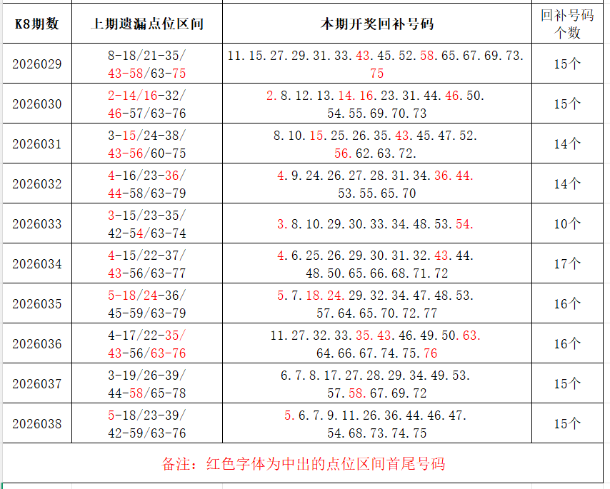 如图,上期的遗漏号码在下期开出10个左右,即为回补号码。定准点位区间首尾号码是关键!以上期2026038期为例,定位4个遗漏区间,围中15码!结合上期开奖号码,以跨度值大于或等于7为依据,本期关注5个遗漏区间:11-20/26-36/36-44/47-54/54-68;重点关注遗漏区间:2-16/25-39/45-58/63-76。点位区间号码和大底号码请勿混淆,个人分析,仅供参考。