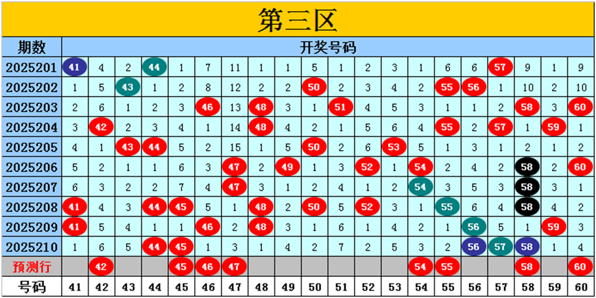 目前第三区包含12个热码:重码5个44、45、56、57、58,邻码4个41、46、55、59,孤码3个48、50、52;包含7个温码:邻码1个43,孤码6个42、47、49、53、54、60;包含1个冷码:邻码0个,孤码1个51;号码冷温热个数比为1:7:12,重号、邻码、孤码个数比为5:5:10。