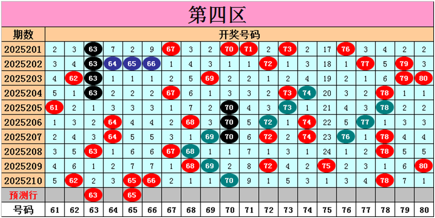 目前第四区包含12个热码:重码5个62、65、66、70、78,邻码3个63、67、69,孤码4个68、72、75、80;包含6个温码:邻码3个61、64、77,孤码3个73、74、76;包含2个冷码:邻码2个71、79,孤码0个;号码冷温热个数比为2:6:12,重号、邻码、孤码个数比为5:8:7。