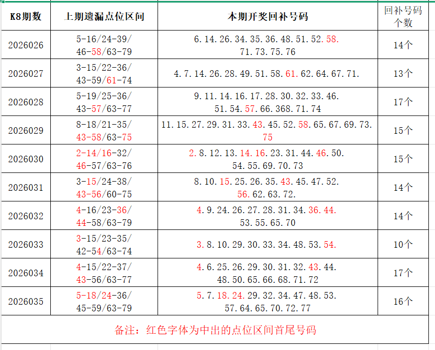 如图,上期的遗漏号码在下期开出10个左右,即为回补号码。定准点位区间首尾号码是关键!以上期2026035期为例,定位4个遗漏区间,围中16码!结合上期开奖号码,以跨度值大于或等于7为依据,本期关注2个遗漏区间:7-18/34-47;重点关注遗漏区间:4-17/22-35/43-56/63-76。点位区间号码和大底号码请勿混淆,个人分析,仅供参考。
