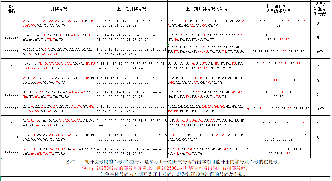 如图,红色字体是上期邻号、邻重号在下期开出,每期开出10个左右。上期邻号开出7个,邻重号开出4个。本期参考邻号:4.8.17.20.22.25.28.30.31.35.46.49.52.54.56.58.61.66.69.73.76.78.79;邻重号:6.18.19.23.24.33.47.48.63.64.65.71;个人分析,仅供参考。