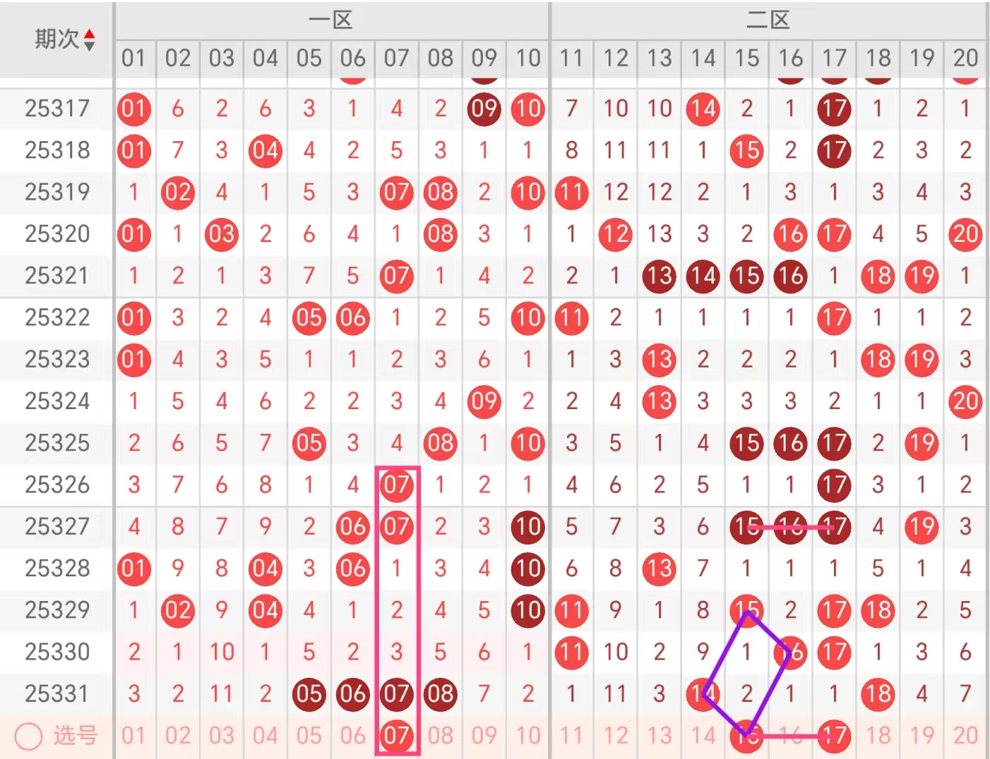 一区(01-10):07号码本期首位看奇数,上期4码同出大概率会掉一个号码,近期07走势也不冷,所以本期07看重!