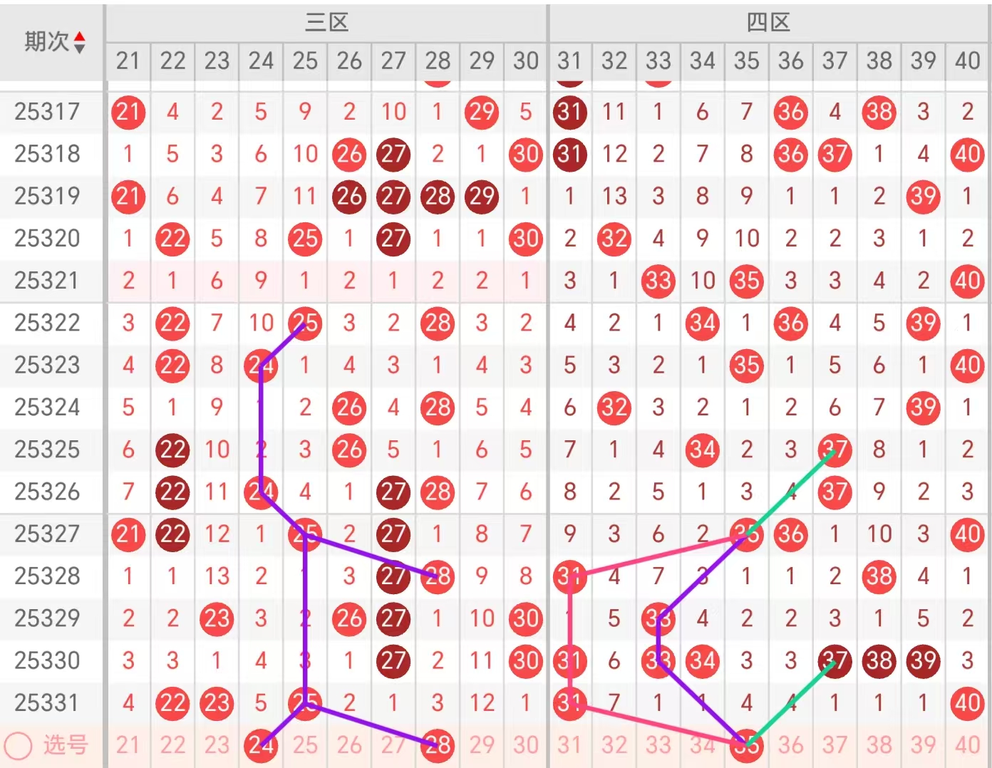 四区:(31-40):35号码空三空四遗漏回补,37下35图上也有标注,35号码有两种形态对称走势,本期一定要重点关注一下!